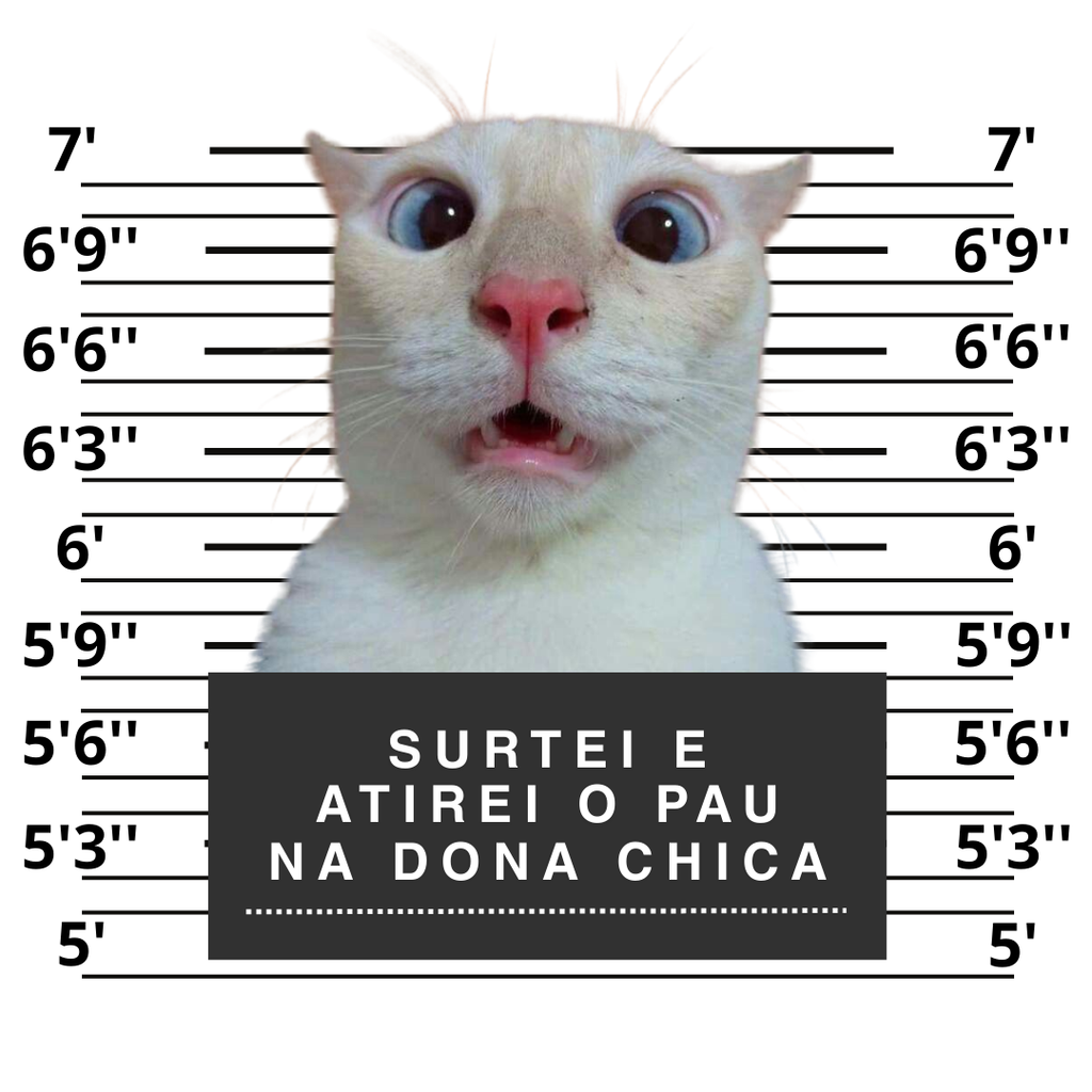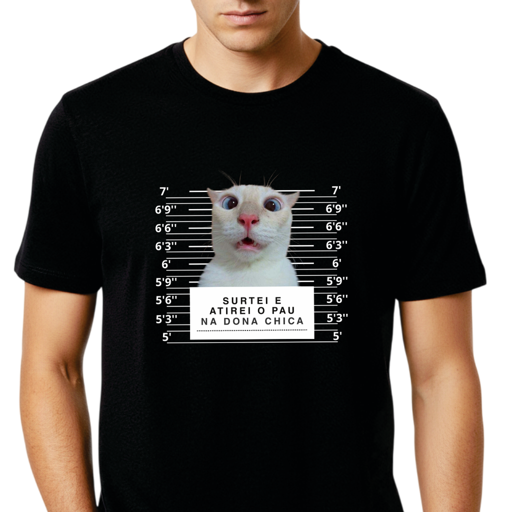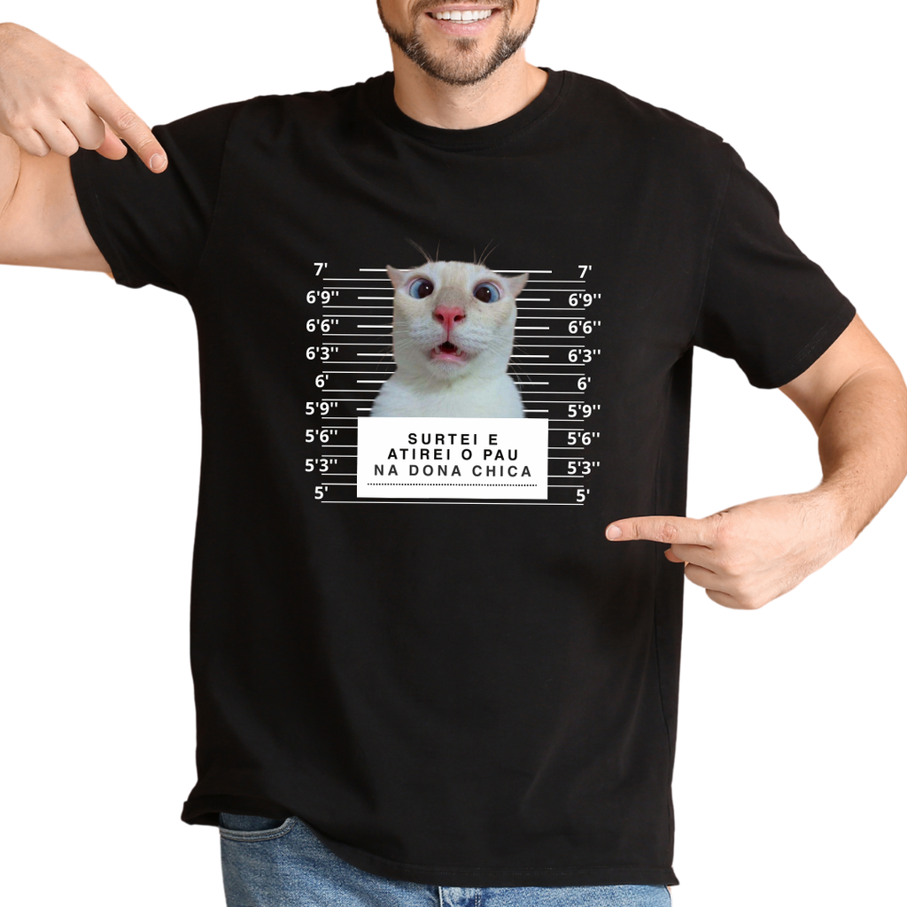 Camisa personalizável no estilo meme/ficha criminal, onde você envia a foto e nós criamos toda a arte para você.