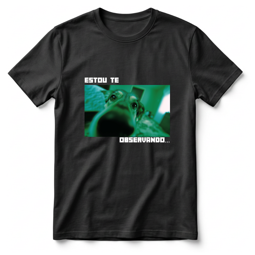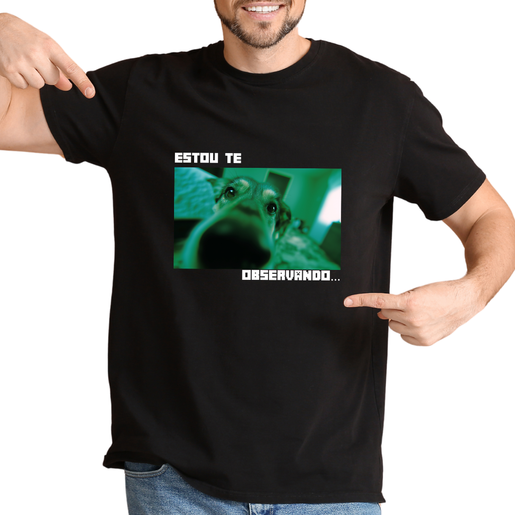 Camisa criativa e divertida, perfeita para quem ama pets e bom humor. A estampa traz a frase “Estou te…” acompanhada da imagem do pet enviada pelo cliente, criando a sensação de que o animal está observando tudo ao redor.