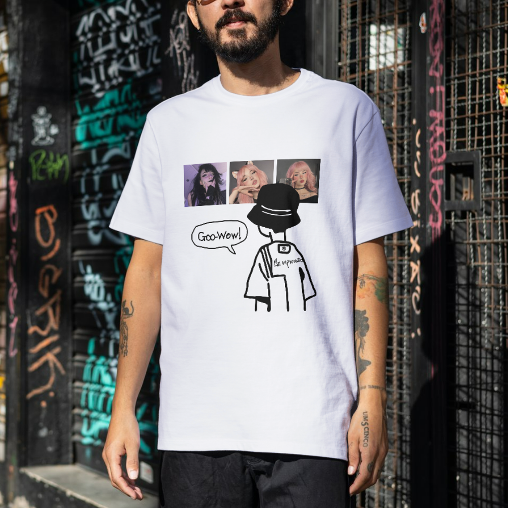 Camisa totalmente personalizável onde você envia 3 fotos, suas, da namorada, do namorado ou de quem desejar, nós criamos a arte completa da estampa. Ideal para transformar momentos especiais em uma peça única e cheia de personalidade.
