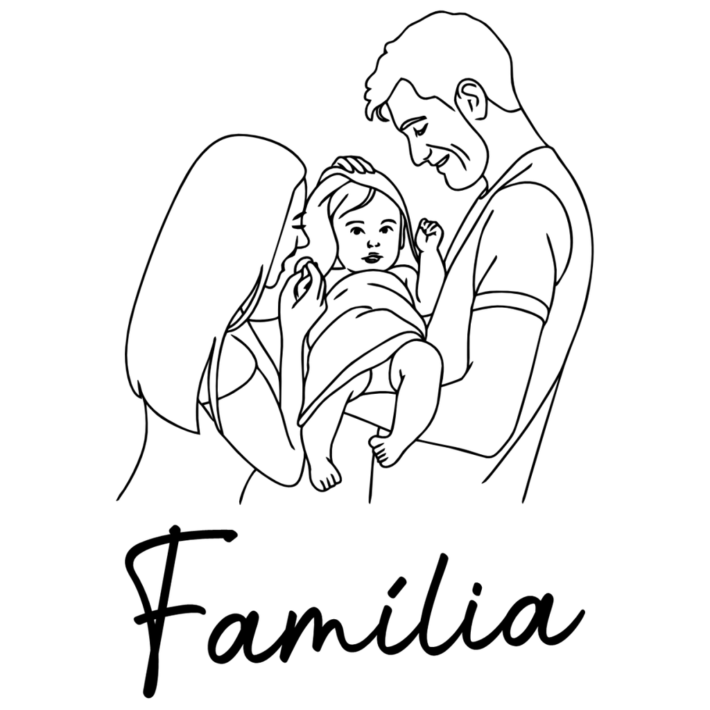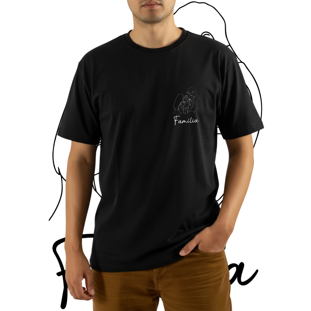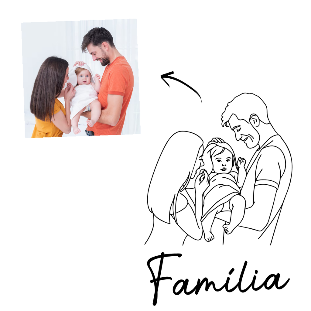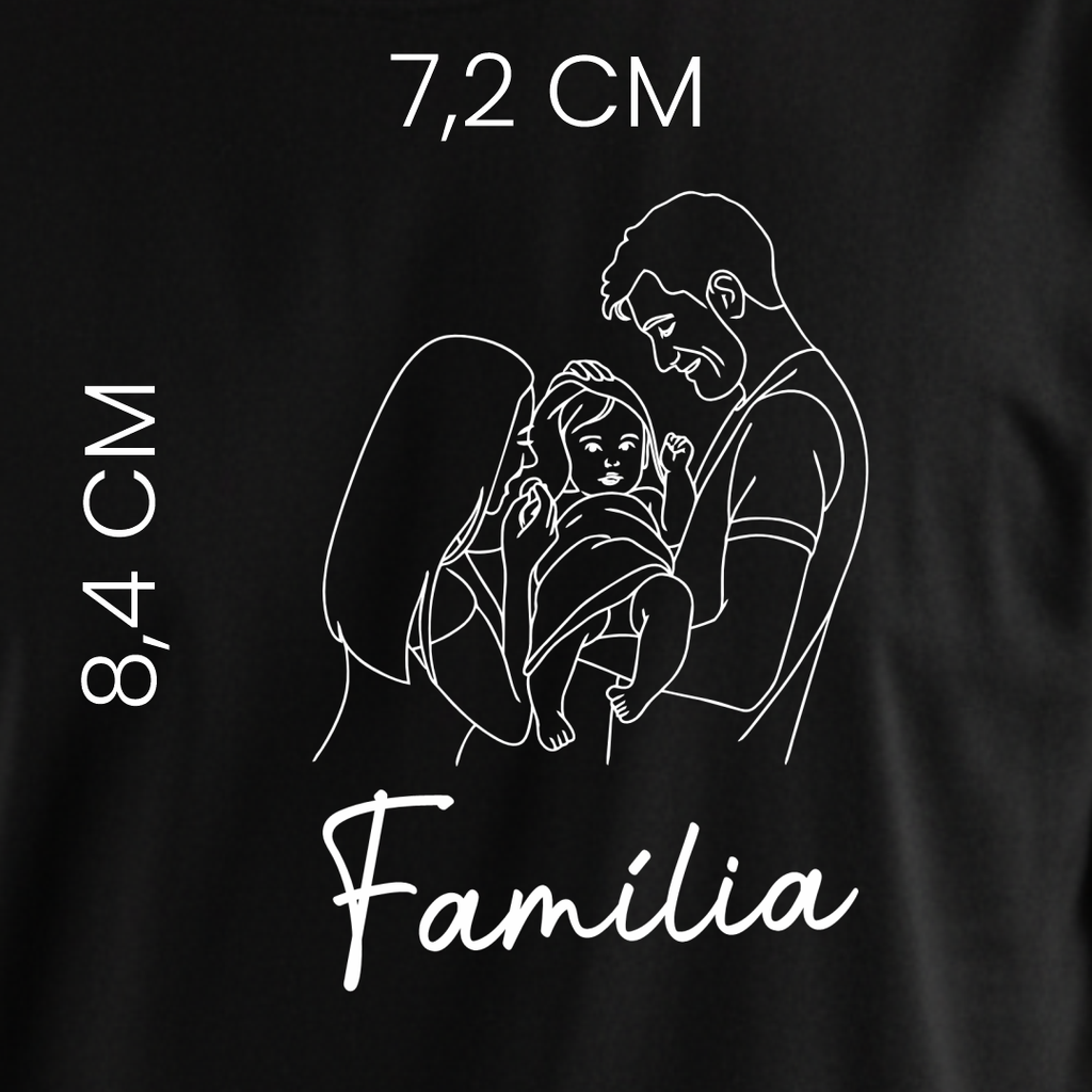 Você envia a foto da sua família, escolhe uma frase personalizada, e nossa equipe transforma tudo em um desenho exclusivo, estampado com alta qualidade e durabilidade.